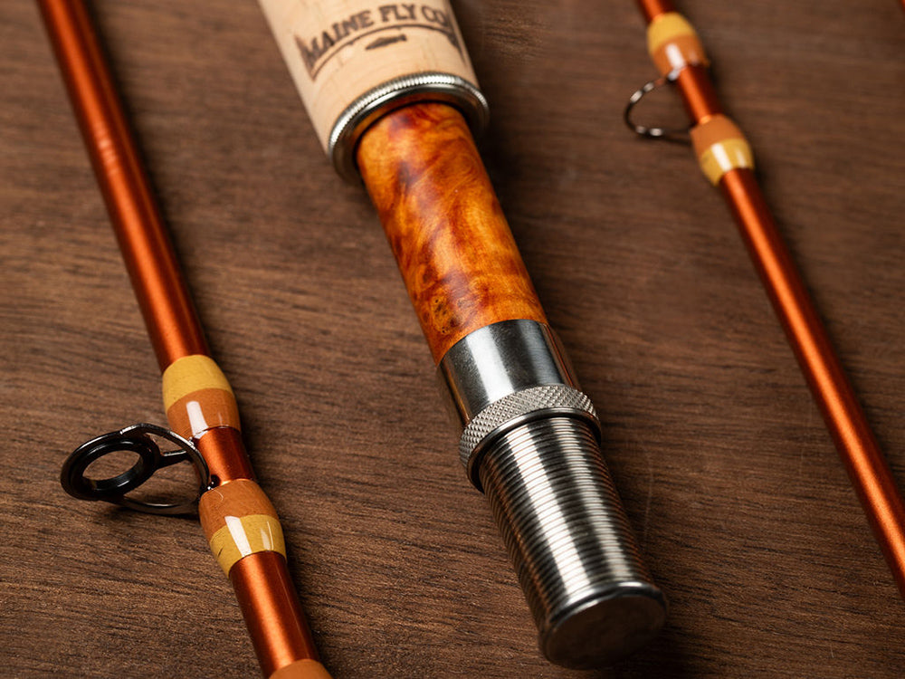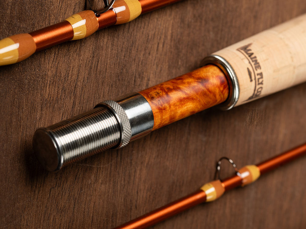 The Roach River features a rust-toned blank inspired by the weathered dams of its namesake river, with wraps that echo the fiery hues of peak-season foliage. A nickel silver seat adds classic character, while every detail reflects the precision and soul of fall fishing in Maine.