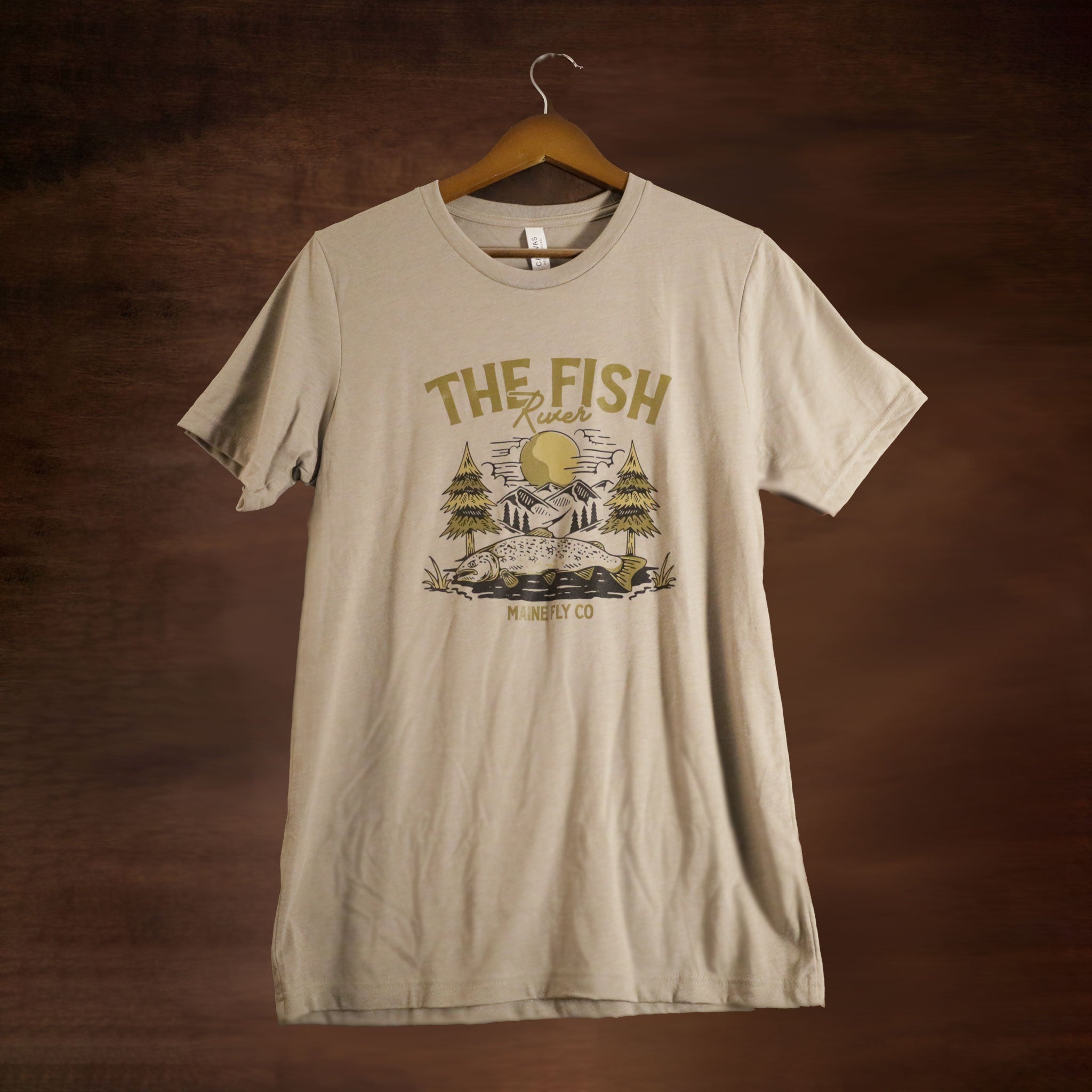 The Fish River Tee is where Maine’s waters meet mountain air. Set on a heather stone canvas, this shirt features a rugged mountain backdrop, a winding river, and a landlocked salmon resting on the shore—a scene designed to echo the spirit of our Fish River Rod. Soft, breathable, and ready for the trail, the tie, or a night around the campfire, it’s built for anglers who know that every cast starts with a place worth remembering. Available in sizes S–3XL.