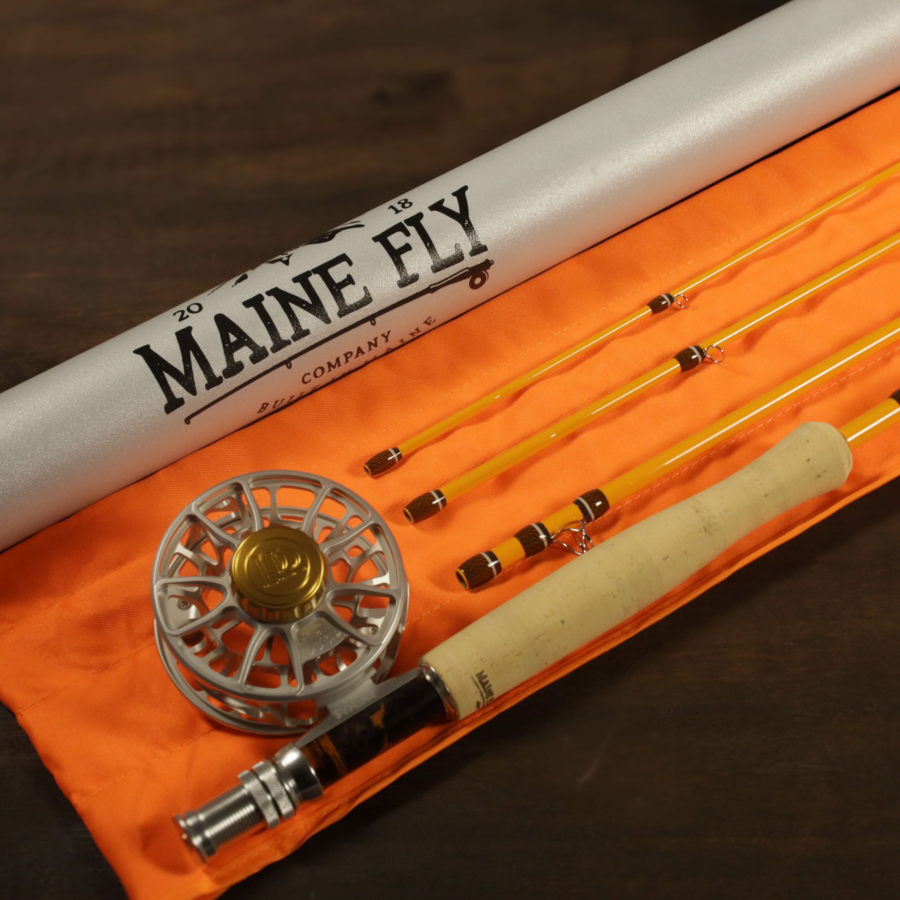 Each rod ships in a matching hunter orange sock and a sleek Maine Fly Co. rod tube, ready for the field.
